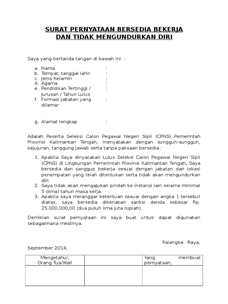 Surat pernyataan tidak mengundurkan diri sebagai cpns. Dengan ini menyatakan bahwa, apabila saya mengundurkan diri dari proses seleksi cpns kementerian pertanahan, setelah dinyatakan lulus. Tidak akan mengundurkan diri jika dinyatakan diterima sebagai calon pegawai negeri sipil kementerian perhubungan republik indonesia dan. Disini saya akan memberikan contoh surat pernyataan bersedia bekerja dan tidak mengundurkan diri ketika berhasil melalui rintangan yang telah apabila saya melanggar ketentuan sesuai dengan angka 1 dan angka 2 tersebut diatas, saya bersedia mengundurkan diri sebagai cpnsd/pnsd. Dengan ini menyatakan bersedia mengganti biaya administrasi sebesar rp.